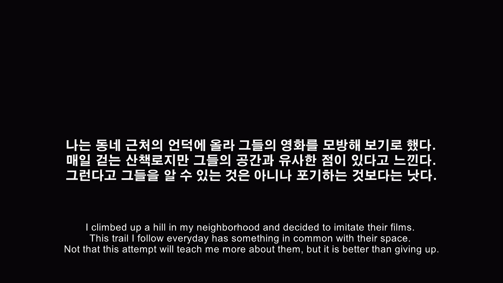 In 2022, Jean-Marie Straub passed away, reuniting with her creative partner and lover, Danièle Huillet, who had died in 2006. Inspired by their films, I embarked on a climb up a hill near my neighborhood. Though it's a trail I walk daily, it somehow echoes the spaces in their works. While this act isn’t enough to truly know them, it's better than giving up entirely.[16th DMZ International Documentary Film Festival]